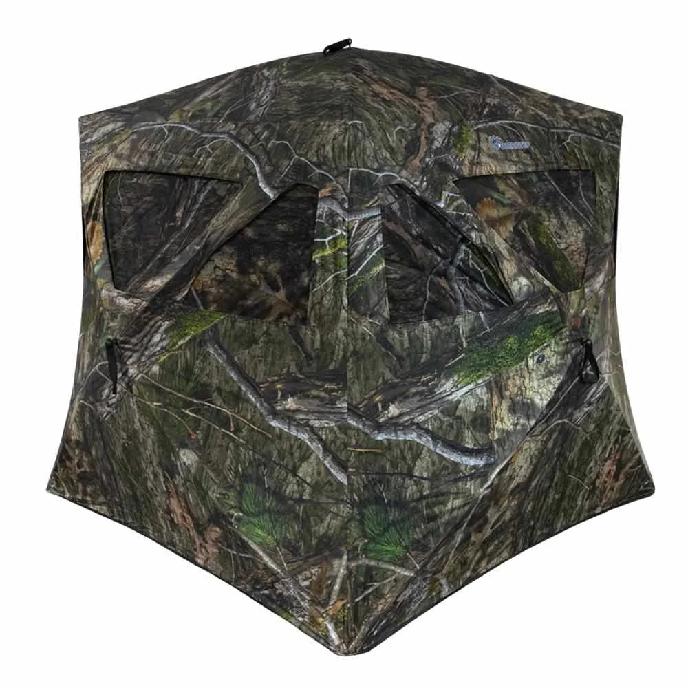 The Wide Bottom design offers 57% more floor space than the previous model creating a wider footprint for a more spacious feel. This design allows for gear storage off to the side or the option to extend chair legs. It also features the new Extreme View one-way mesh allowing you to see out while preventing game from seeing in. The blind is equipped with a new Silent hook and elastic triangular window system providing easy and quiet window adjustments. Additionally it includes a ShadowGuard coating to eliminate shadows and silhouettes. The rugged Spider Hub frame ensures easy setup and takedown while the integrated compression backpack strap carry system makes transport simple. The easy-access V-shaped zippered door and interior mesh storage pocket offer added convenience.