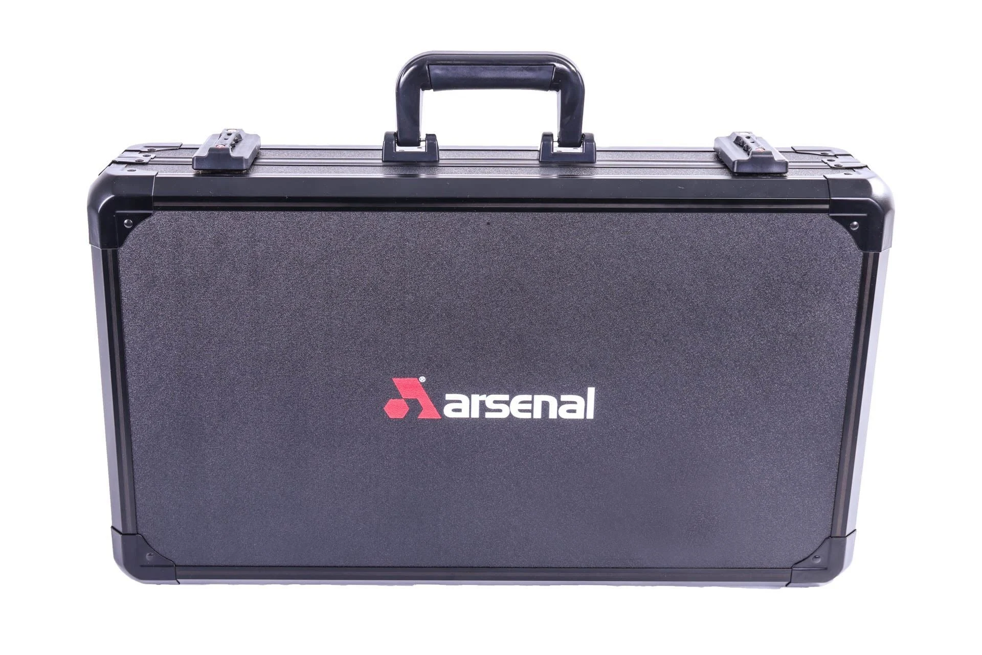 The case is fabricated with aluminum reinforced corners and edges to maximize impact resistance. The combination locks include TSA locks to ensure compliance with TSA regulations. The Arsenal logo is proudly displayed on the top of the case.