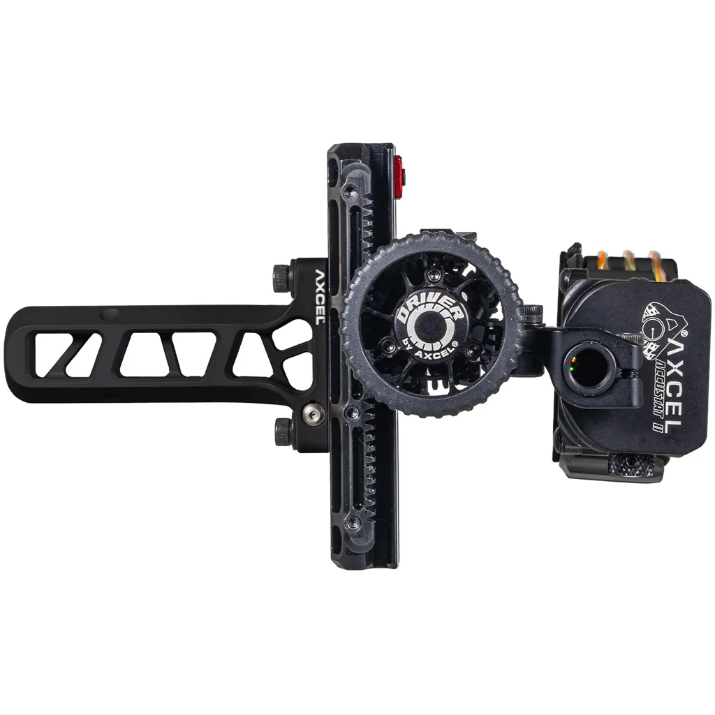 The Axcel Driver CK Standard Pro with AccuStat II Multi Pin Scope is a precision hunting sight built with a compact profile and a durable Cerakote finish. It features a pro dovetail mount with multiple mounting positions, centralized controls, and smooth micro-adjustable elevation and windage systems. A large drive wheel with rubber tread, combined 1st and 2nd axis adjustment, and an adjustable dead stop support accurate dialing at extended distances. The AccuStat II 1-3/4 inch scope housing uses multiple pin configurations and fiber size options to suit varied aiming preferences. This sight is configured for consistent performance in demanding field conditions.
