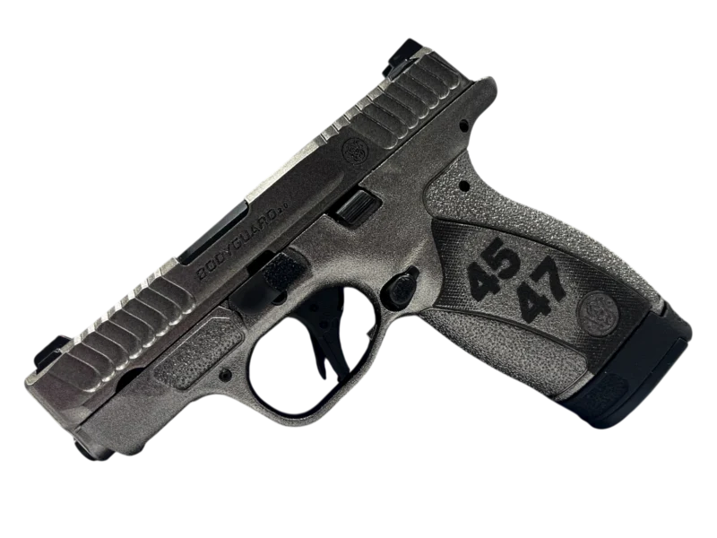 The 92XI Combat series features the 92XI Single-Action Only (SAO) pistols. The 92XI brings frame mounted safety to the standard 92 family of products, as well as a single action only variant and various ergonomic enhancements. The frame mounted safety offers an ambidextrous solution, bringing the safety lever more in reach with natural ergonomics. The 92XI features the X-treme-S single action only and flat-faced trigger, performance DLC coated trigger components and a lightweight skeletonized hammer, allowing for a crisp trigger pull with the option to go cocked and locked. The 92XI carries forward the Vertec style frame, a fiber optic front sight for faster sight acquisition and the option for MRDS optics mounting making this a high performing, reliable choice for personal defense and competition. Each pistol is hand painted by veteran-owned company Howe Arms, which makes each pistol unique by having its own footprint. Chocolate chip is a nickname for the six-color desert camouflage pattern developed by the U.S. in 1971, used initially in the Sinai and most notably during Operation Desert Shield/Storm and in Somalia.