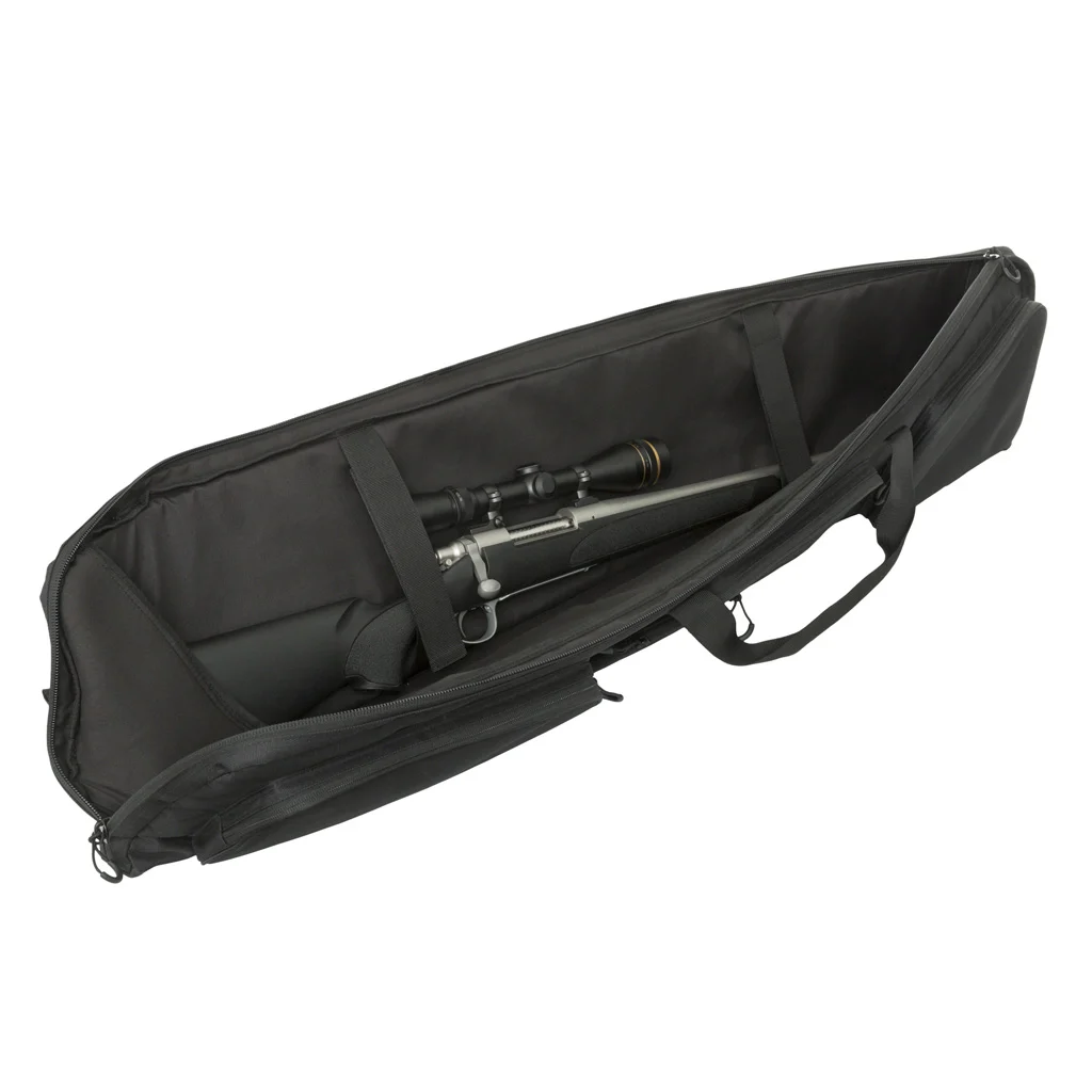 Case featuring rugged 900D shell and dual-density padding to keep your firearms safe. Fits most guns up to 46? and features 3 accessory pockets with easy pull zippers. Padded carry handles make it easy and comfortable to carry around. Two velcro straps and brushed polyester triangles on each end of the case assist in securing the firearm. Internal dimensions are 46? x 2? x 9.5?.