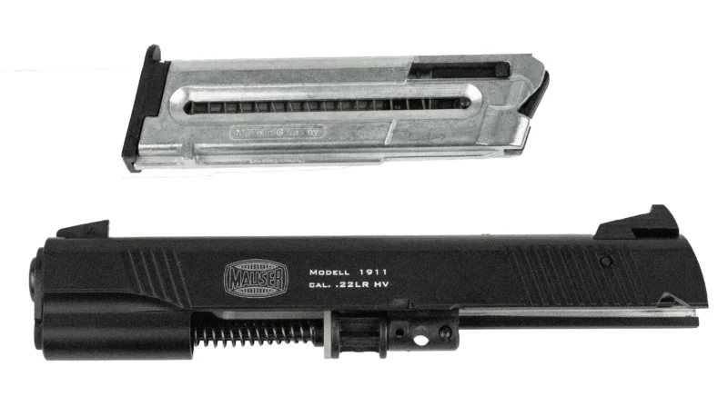 A drop in slide conversion kit from German Sports Guns. Converts your .45 1911 pistol to a .22LR 1911 pistol. Comes with slide barrelone ten round magazine and instructions in a plastic storage case. The GSG conversion kit is designed for full sized (Gold Cup/Government/Combat Commander) 1911 frames (it will not fit the Officers/Titan sized frames) and it comes with the parts kit to work on both 70- and 80-series type 1911 pistols.
