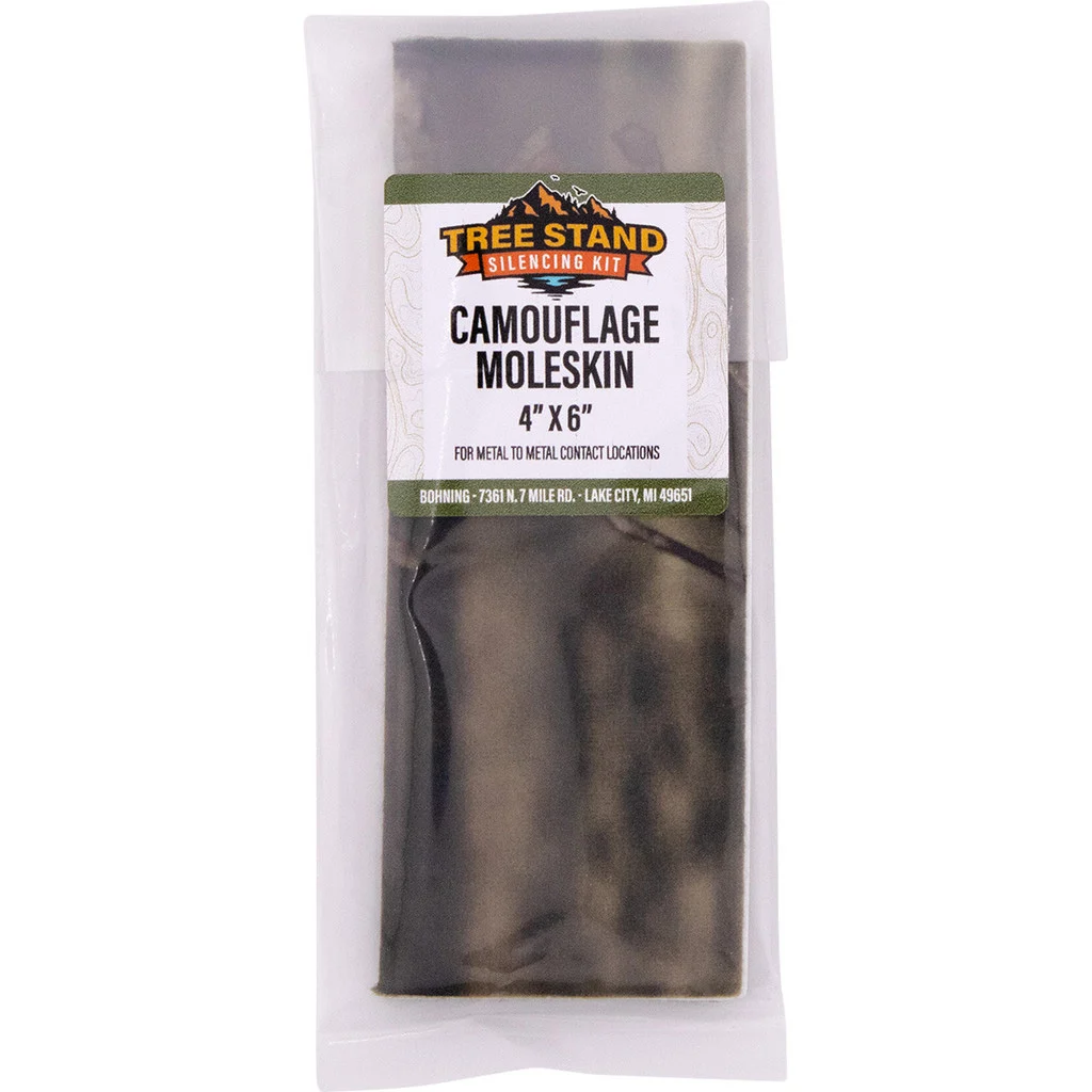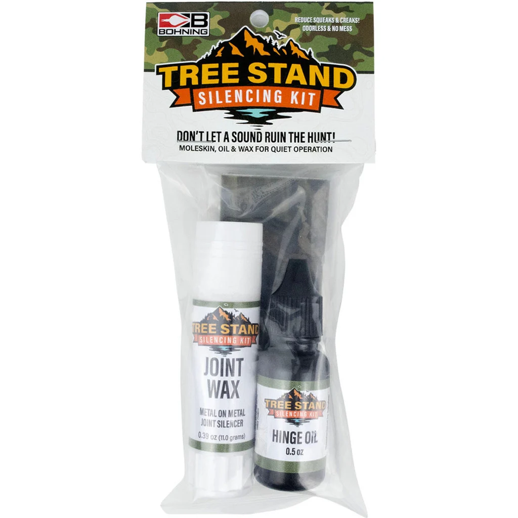 This silencing kit includes three components designed to reduce noise from tree stand movement. The kit features an odorless hinge lubricant in a 0.5-oz bottle, joint wax in a 0.39-oz tube, and a 4 x 6-inch adhesive moleskin sheet for metal contact points. Each item helps minimize squeaks, scraping, and clanging while remaining effective in extreme weather. All components are odorless and formulated for clean, freeze-free application.