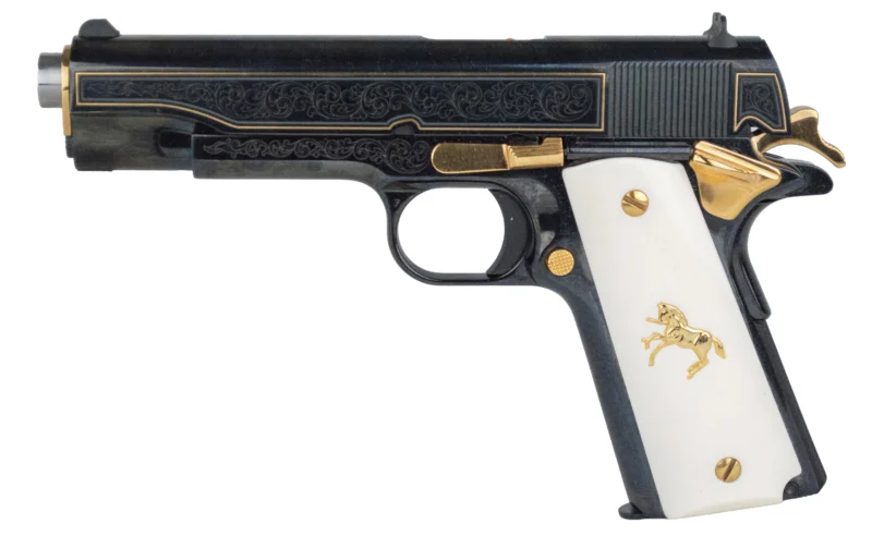 Bill Hicks & Co. Ltd. is proud to release their exclusive Colt Government Model .45ACP Classic Engraved 1911. – This stunning 1911 has been meticulously high polished throughout with intricate high coverage leaf scrollwork on both the slide and frame. 24 kt. Gold borders on the slide with 24kt gold small parts and Gold rampant pony on the presentation white grips rounds out this stunning piece. – Available for a limited time the Bill Hicks Classic Engraved Colt Government 1911 is sure to become an instant collectable.