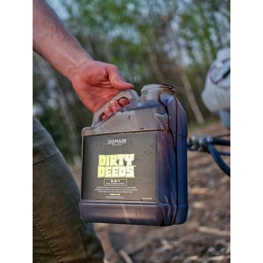 Dirty Deeds Soil Conditioner is a concentrated humic-based soil additive formulated to improve soil structure and support plant development. Enhanced with seaweed extract and a proprietary surfactant, it promotes micronutrient uptake, increases water infiltration, and helps stabilize nitrogen in various soil types including sandy, silt, and clay soils. The formula aids in reducing drought stress and nitrogen salt injury while supporting forage production and overall plant growth. Recommended application is 64 oz per 1/2 acre with a minimum of 5 gallons per acre total solution. Designed for direct soil application and repeat use throughout the year.
