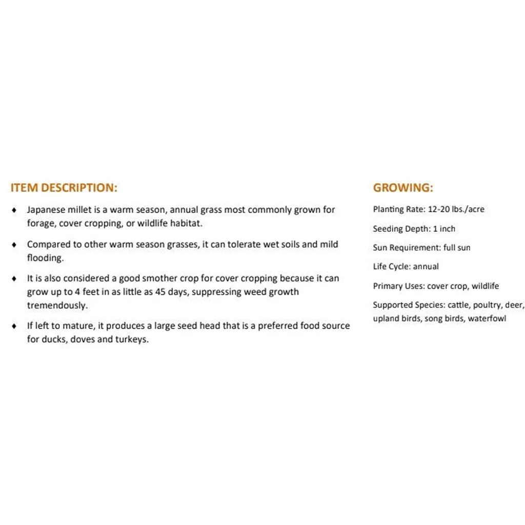 Japanese Millet is a warm-season annual grass suited for wildlife habitat and adaptable to wet or moderately drained soils. It can reach 3 ft to 4 ft tall in under 60 days and tolerates mild flooding, making it suitable for diverse planting environments. Once mature, it produces seed heads that provide a reliable food source for various wildlife species. Plant when soil temperatures reach at least 65 degrees for proper germination. Offered in a 4 lb jug covering up to 1/4 acre.