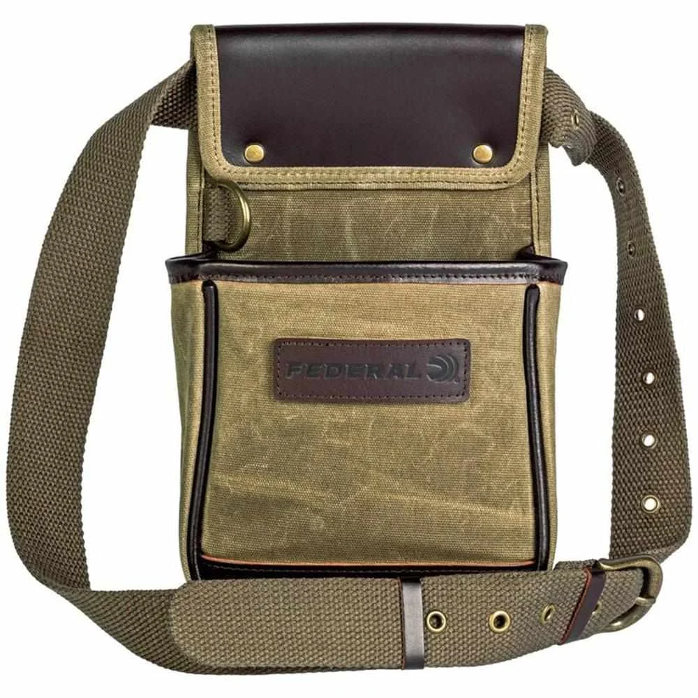 Break clays in style with the Federal Premium Shell Pouch. It features 18-ounce waxed canvas construction top-quality zippers leather accents brass hardware and embossed leather logo patches.