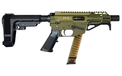 Freedom Ordnance FX9P4S FX-9 9mm Luger 31+1 4″ Black Nitride Barrel w/Faux Suppressor, Black Hard Coat Anodized Aluminum Receiver, SB Tactical SBA3 Pistol Brace Stock, Black Polymer Grip