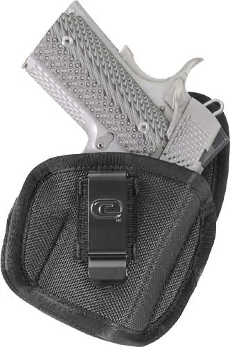 The ambidextrous Tuck-N-Go 2.0 is supplied with two types of interchangeable tuckable clips. The first is the UniClip, designed to go over the belt, but also works well without a belt. The second is the Ultimate Stealth clip with hook, which fits on the trouser waistband, under or behind a belt with just the clip showing, for concealment. The belt clips are adjustable for cant, making it suitable for the strongside, crossdraw or appendix carry positions. The UniClip fits belts up to 1.50″, the Ultimate Stealth clip fits belts of unlimited width. Fits Glock 26, 27 Gen3-5, 33; Taurus G2c, G2s, G3c.
