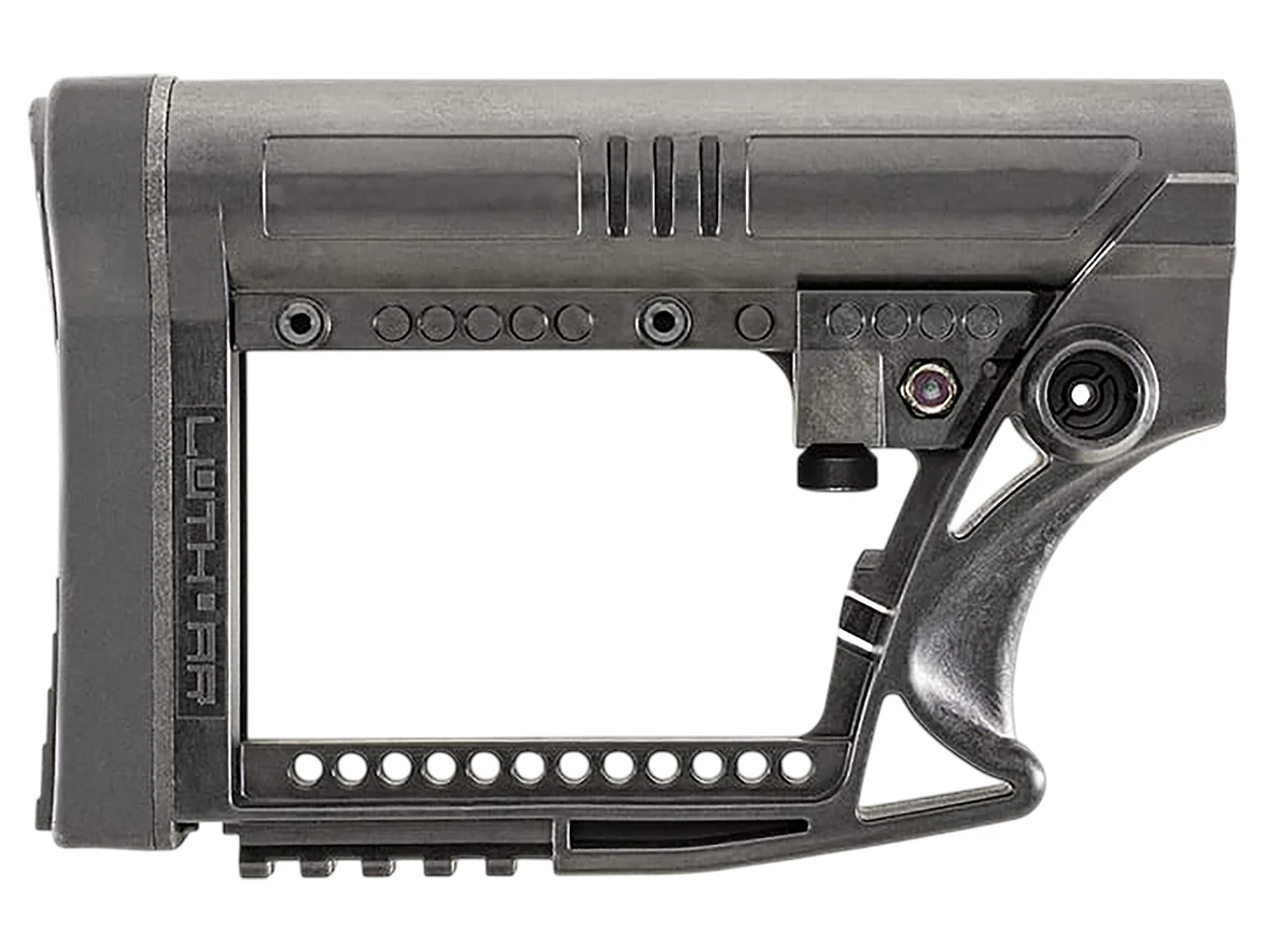 The AR OverMolded 2-piece kit features a collapsible buttstock and a beavertail grip with finger grooves. This model has an Aqua finish and is compatible with commercial buffer tube.