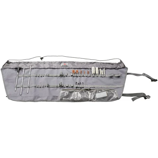 The Hoppe’s Ready Roll with Dry Cleaning Kit will keep your cleaning tools organized on the range or out in the field. The elastic accessory slots will keep the included universal dry cleaning kit pieces secure and the zipper compartments can store small loose parts in one place. When it’s time to head out roll up the Ready Roll and secure it closed with the attached nylon straps and buckles to use it as a tool roll. If you need to take more than just your cleaning tools with you install the Ready Roll into any standard five gallon bucket by lining the inside of the bucket with the Ready Roll secure the attached band around the top of the bucket and cinch the cord lock to keep the Ready Roll in place. The universal cleaning kit includes a three-piece aluminum cleaning rod bronze brushes and mops for .22 .30 .380/9mm 20GA and 12GA as a three nylon jags a shotgun patch loop a shotgun adapter and cleaning patches. Wherever you want to go the Ready Roll is built to keep your tools where you need them. – Includes a dry universal gun cleaning kit – Made out of heavy duty rip-stop material – Elastic webbing keeps cleaning tools and accessories in place – Two zipper pockets to store small pieces – Fits inside a standard five gallon bucket – Doubles as a tool roll