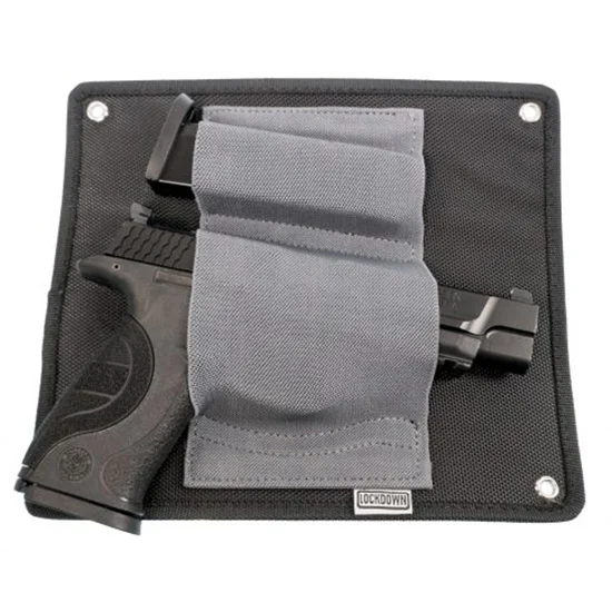 Made of nylon with re-enforced backing for rigidity – 4.25 wide elastic holster holds handguns from compact semi-autos to full frame revolvers – Accessory/magazine elastic holster along side – Ambidextrous – Includes Under Desk Holster and 4 mounting screws – Dimensions: 8.5 wide x 10 long x .125 thick (unloaded)