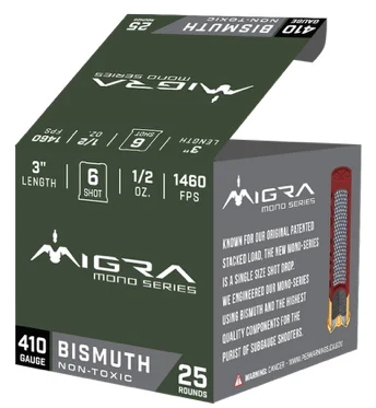 Guage 410 – Length 3” – Shot 6 – Weight 1/2oz – Velocity 1460 – Rounds per Box 25