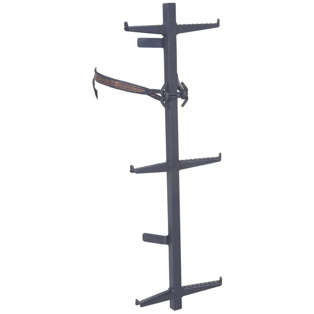 The M240 climbing sticks are constructed of steel and feature a stackable single tube design with double sided angle steps and double loop connection straps with easy pull cam buckles. Weigh 4.5 lbs each and are 32″ in length.