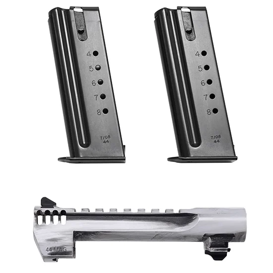 Convert your Mark XIX Desert Eagle .50AE to a;.44 Magnum with this conversion kit! Conversion kit includes one Desert Eagle;.44 Magnum 6 White Matte Distressed with Intergrated Muzzle Brake Barrel and two 8 round Magazines