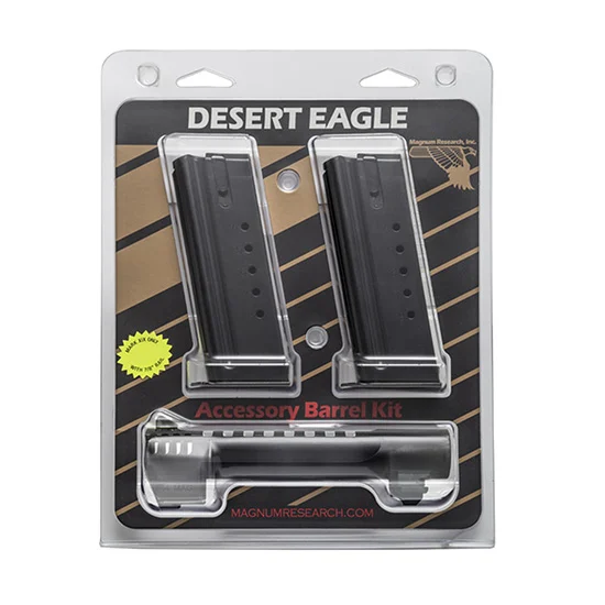 Convert your Mark XIX Desert Eagle .44 Magnum to a.50 AE with this conversion kit! – Conversion kit includes one Desert Eagle .50 AE 6 Tungsten w/ Intergrated Muzzle Brake Barrel and two 7 round Magazines (MAG50)