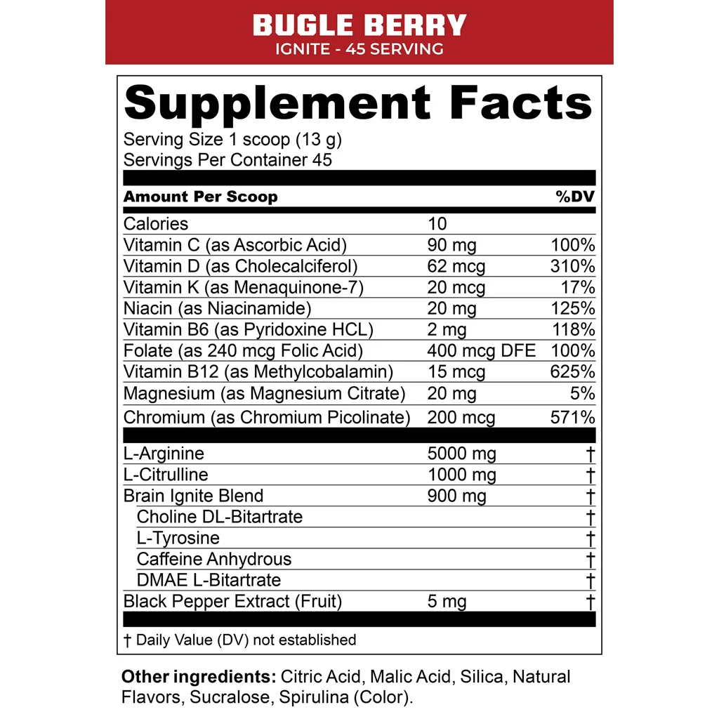 MTN Ops Ignite in Bugle Berry flavor is a powerful energy and performance supplement designed to fuel your mind and body. Each scoop delivers 200 mg of caffeine paired with L-Arginine, L-Citrulline, and a proprietary blend of nootropics to boost cognitive function and enhance physical performance. This clean formula contains zero sugar and is gluten-free, offering a smooth, long-lasting energy boost without the crash. Ideal for early mornings, workouts, or long days, Ignite helps sharpen focus, improve endurance, and increase nitric oxide production for better blood flow. With 45 servings per 21 oz tub, it’s a reliable go-to for daily energy support.