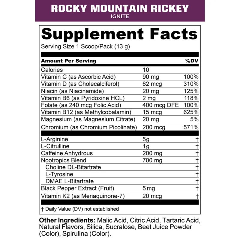 MTN Ops Ignite in Rocky Mountain Rickey flavor delivers a clean and effective energy solution tailored for mental clarity and physical endurance. Each scoop provides 200 mg of caffeine combined with L-Arginine, L-Citrulline, and a proprietary nootropic blend to enhance cognitive performance and boost nitric oxide levels. With zero sugar and gluten-free ingredients, this 21 oz tub offers 45 servings of long-lasting, great-tasting energy without the crash. Whether you’re hitting the gym, the trail, or powering through a busy day, Ignite keeps you focused and energized with smooth, sustained performance.