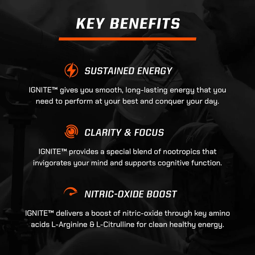 Ignite, through scientifically formulated blends of amino acids, L-citrulline and L-arginine, and a proprietary brain blend of nootropics to improve cognitive function, Ignite delivers smooth, long-lasting, jitter-free and great tasting energy and focus for up to 20+ hours.