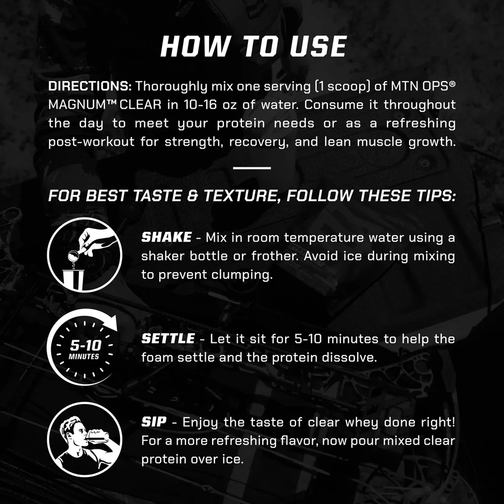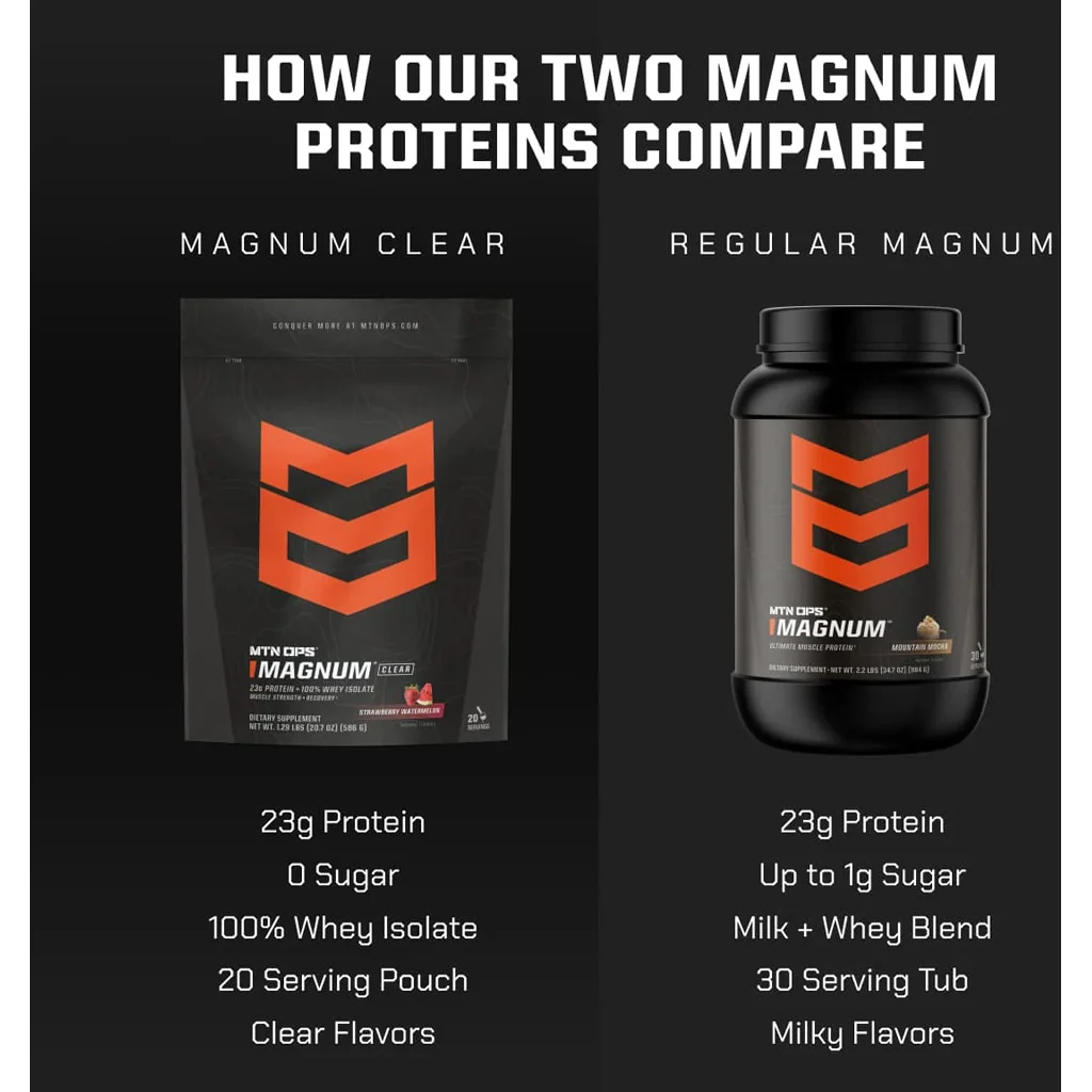 MTN OPS Magnum Clear is a fast-absorbing whey isolate formula designed to support muscle strength, recovery, and overall performance. Each serving delivers 23 grams of protein with less than 1 gram of carbohydrates, zero sugar, and a light, refreshing flavor profile. Made from high-quality whey isolate, it promotes lean muscle growth and improved fitness without the heaviness of traditional protein shakes. This gluten-free formula provides clean daily nutrition for athletes seeking crisp taste and efficient fuel.