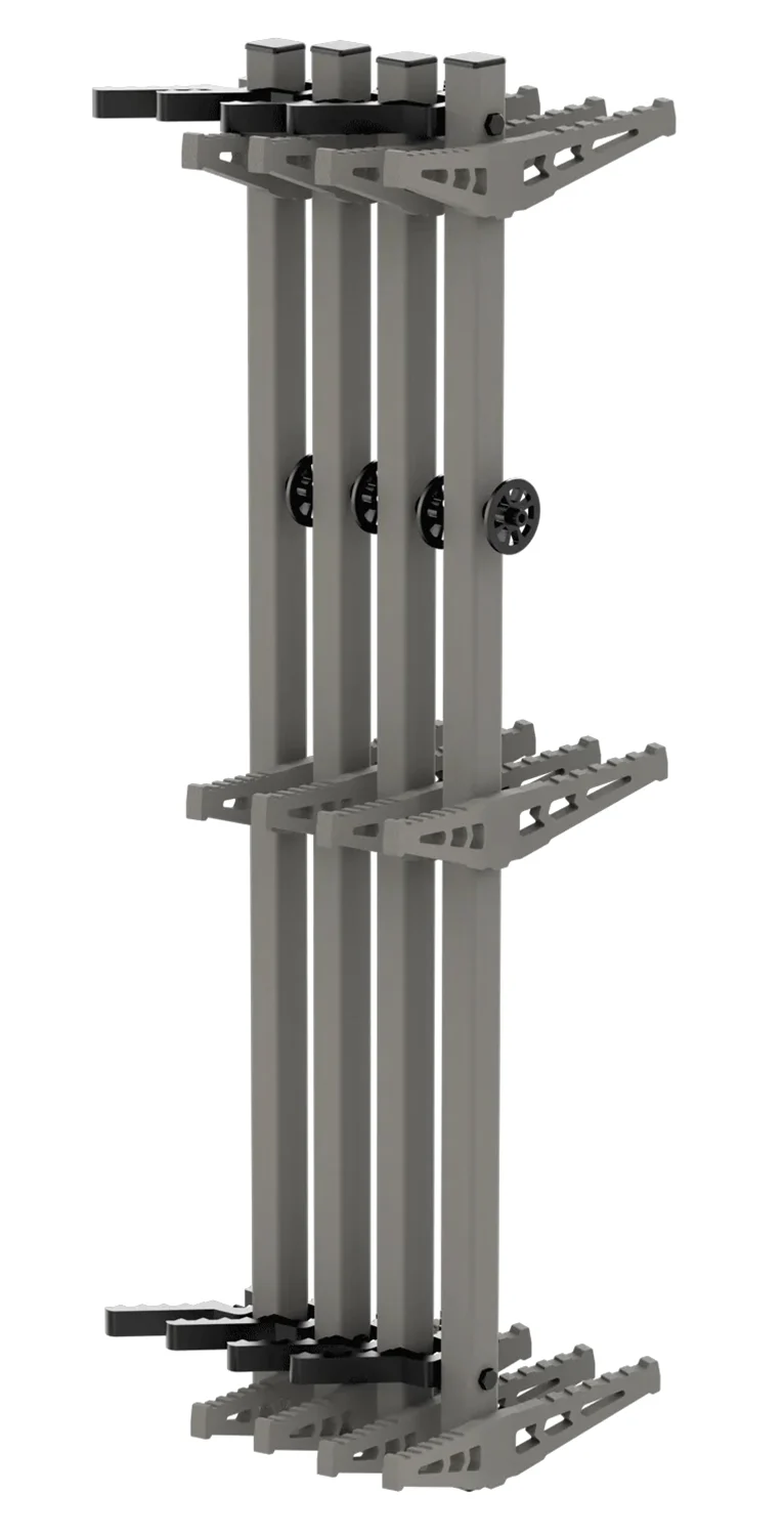 Sold in packs of four (4), these 32″ climbing sticks should get you anywhere from 15-20 feet up if placed moderately. The bottom step comes equipped with a buckle strap to hold all four together for easy organization and stacking. The aluminum V-Bracket locks into tree bark for a solid, silent hold even in the coldest temperatures. Step-to-Step Spacing: 15 in, Foot Clearance: 4 in, 3 Steps