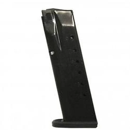 10-round magazine – Fits Smith & Wesson M&P 9 9mm series pistols – Magazine body constructed of heat treated steel with black oxide finish – Injection molded magazine follower – Magazine spring formed from heat treated chrome silicone wire – Restricted capacity 10-round version of 17-round SMI-A12 magazine – Made in USA
