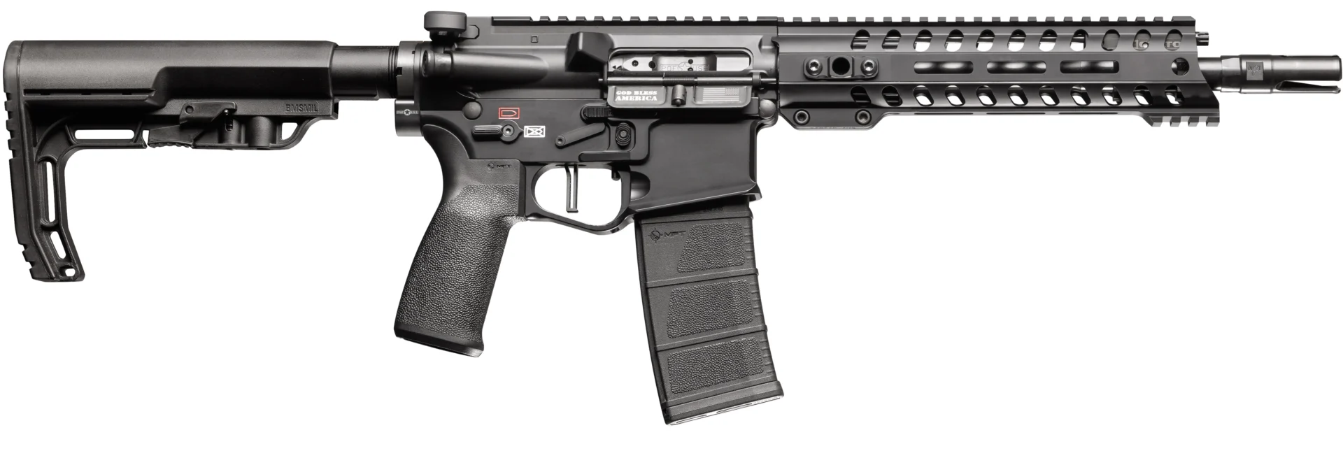 The Boombox features a direct impingement operating system. Featuring a billet receiver set with similar Honey Badger controls, Q-Sert M-LOK aluminum handguard, proprietary bolt carrier/buffer system, 12″ threaded, 1:3 twist barrel and adjustable gas block.