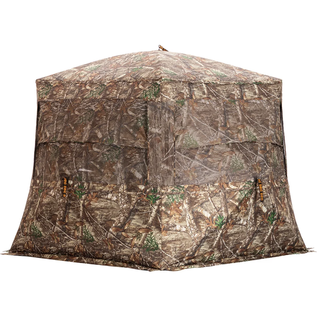 The Rhino Low Hub Blind’s innovative lower hub design enlarges the shooting area with windows extending closer to the floor, perfect for seated archers and gun hunters. The 72” x 72” floor footprint affords ample room for gear and multiple occupants while maintaining the familiar ceiling size of standard blinds. Featuring silent slide windows and see-through mesh, visibility is maximized without compromising stealth. Durable 300 Denier fabric, a backpack carry case, and upgraded stakes all support the 68″ tall structure, ensuring a stable, spacious hunting haven.
