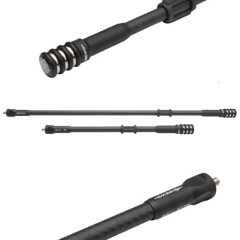 The RevX stabilizer is high-end tournament stabilizer designed for both compound and recurve bows offering internally tapered carbon composite maximizing rigidity while minimizing weight. The addition of an Internal Truss Dampening System further dampens vibration improving accuracy. The RevX has a .630″ O.D. and includes three, 1 oz. tungsten weights, four, 1/3 oz. aluminum weights and a 5/16-24 thread.