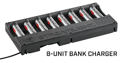 8-Unit Bank Charger: – Organize store and charge up to 8 battery packs – Charge time: 5.25 hours – Charge bays securely hold battery packs in place- ideal for truck mounting – Charge indicators of each battery pack slot: Red = Charging Green = Charged – Low profile- 1 in (2.54 cm)- minimal mounting area required – Impact-resistant polymer construction – 10.45 in x 4.74 in x 1.0 in (26.54 cm x 12.06 cm x 2.54 cm); 7.6 oz (216g) w/o battery packs; 20.88 oz (592g) w/ battery packs – Meets the requirement of NFPA 1900-11.1.11.2 (2024)