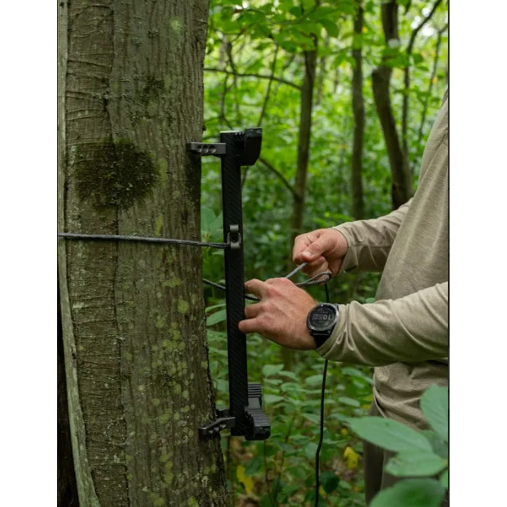 The C2 Carbon Fiber Climbing Stick is a carbon climbing stick designed for quiet packability and increased foot room. It features 9-inch non-slip CarbonTek steps, a redesigned 4.5-inch standoff for secure tree bite, and built-in magnets that stack up to four sticks without straps. Glow-in-the-dark NinjaGlow end caps aid low-light placement, and the stick includes an Amsteel attachment method with compatibility for SSP rope and most ultralight climbing methods.