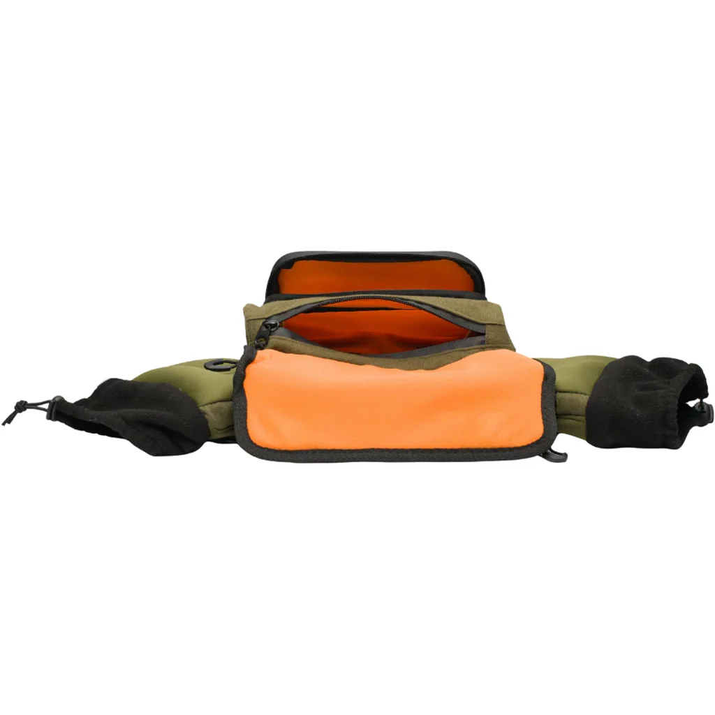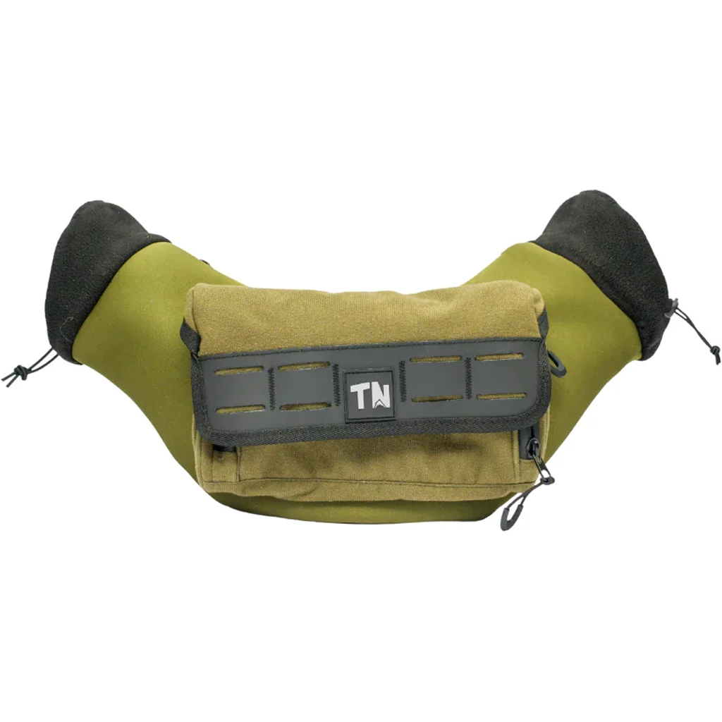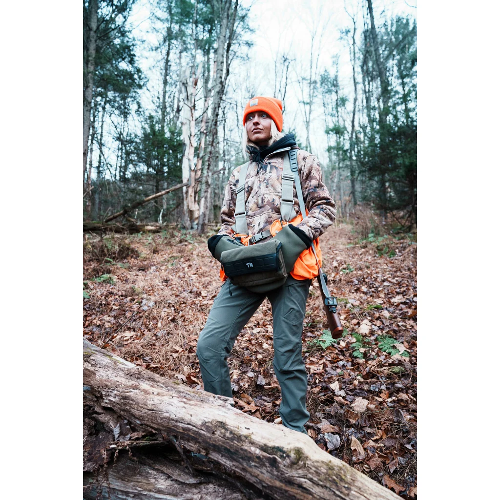 The Frostline Insulated Hand Warmer combines an insulated hand muff with integrated storage for mobile and ground hunting. It features angled hand openings with cinch cords, plus a water-resistant and windproof exterior for cold, wet conditions. Storage includes a top-entry pocket with a waterproof number 8 zipper and a front pocket with a magnetic closure for quick, quiet access. It can clip to a saddle bridge using included carabiners or be worn on a belt.